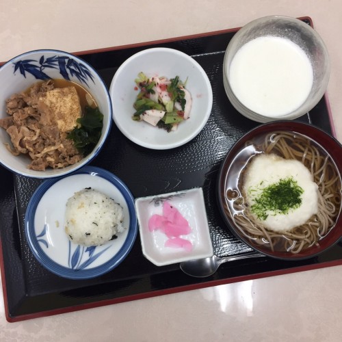 メニューは、とろろそば、肉豆腐、かぶの梅酢和え、ミニおにぎり、漬物、牛乳寒天です!