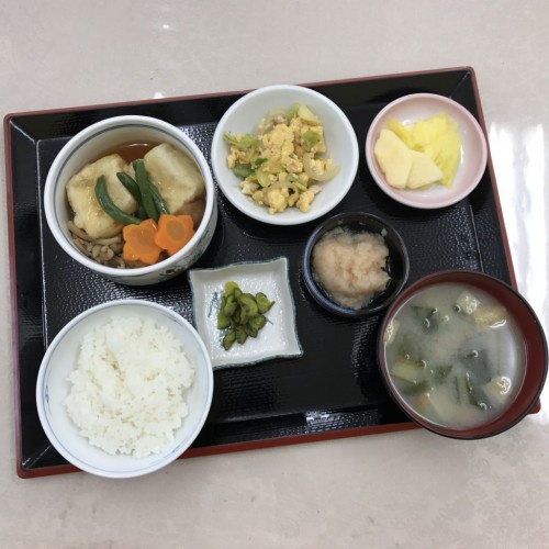 メニューは、揚げ出し豆腐、きゃべつの玉子とじ炒め、なます、ごはん、味噌汁、漬物、フルーツミックスです!