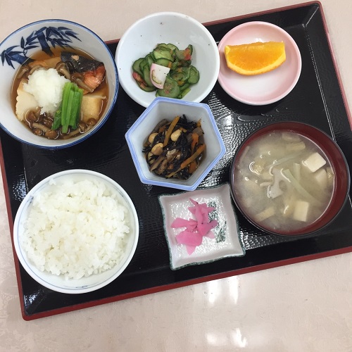 メニューは、鮭のみぞれ煮、ひじきの煮、きゅうりのゆかり和え、ごはん、味噌汁、漬物、オレンジです!