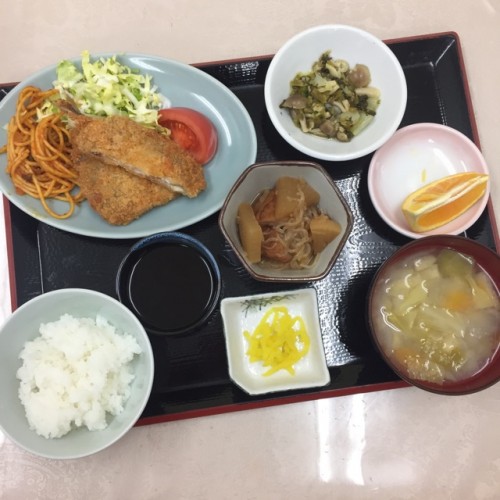 メニューは、アジフライ、厚真揚げの煮物、高菜としめじの和え物、ごはん、スープ、漬物、オレンジです。