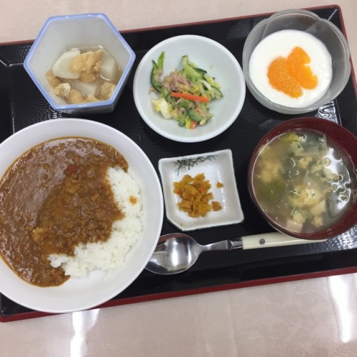 メニューは、キーマカレー、かぶと油揚げの煮物、コールスローサラダ、スープ、漬物、牛乳かんてんです。