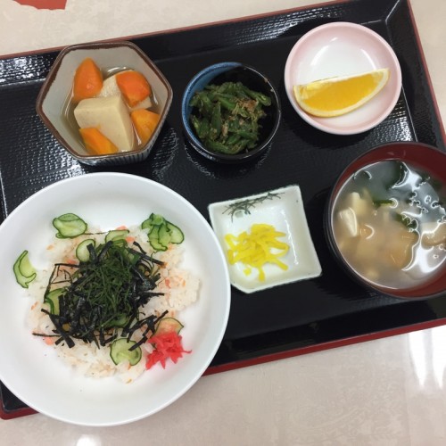 メニューは、鮭ちらし寿司、高野豆腐の煮物、いんげんのおかか和え、味噌汁、漬物、オレンジです。