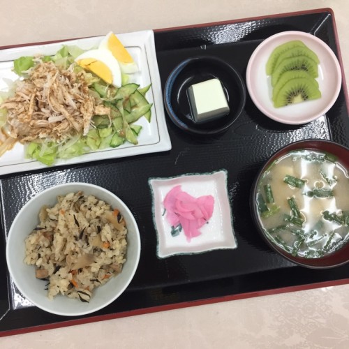 メニューは、炊き込みごはん、バンバンジー、ごま豆腐、味噌汁、漬物、キウイです。