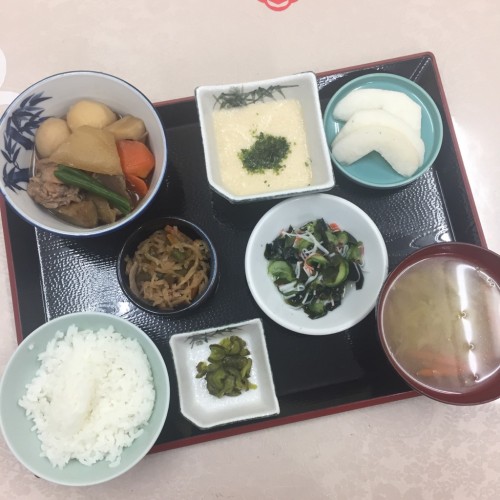 メニューは、筑前煮、とろろ、きゅうりとわかめの酢の物、切干大根の煮物、ごはん、味噌汁、漬物、梨です!