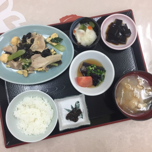 メニューは、豚肉と木耳の玉子炒め、なすの煮浸し、かぶの柚子胡椒和え、ごはん、味噌汁、漬物、コーヒーゼリーです!
