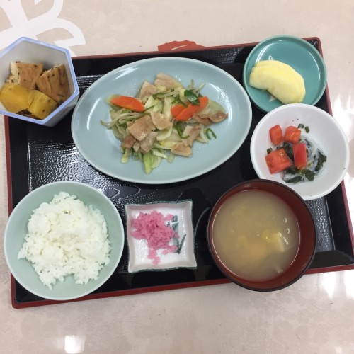 メニューは、肉野菜炒め、がんもの煮物、トマトの和え物、ごはん、味噌汁、漬物、りんごです!