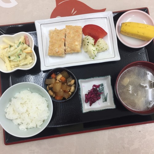 メニューは、松風焼、大豆の煮物、マカロニサラダ、ごはん、味噌汁、漬物、バナナです。