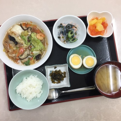 メニューは、八宝菜、煮卵、春雨の酢の物、ごはん、味噌汁、漬物、ミックスフルーツです。