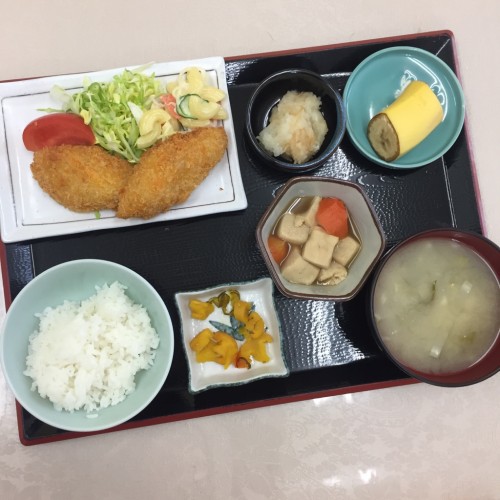メニューは、白身魚フライ、高野豆腐の煮物、なめ茸の和え物、ごはん、味噌汁、漬物、バナナです!