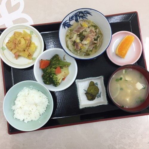 メニューは、豚肉と白菜の煮物、じゃがいものカレー炒め、ブロッコリーのおかか和え、ごはん、味噌汁、漬物、オレンジです。