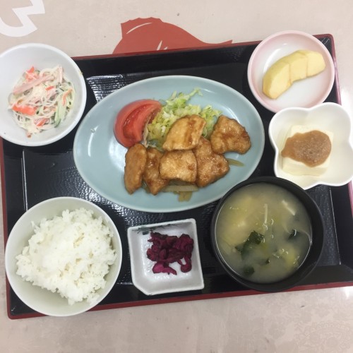 メニューは、鶏肉の生姜焼き、豆腐の味噌田楽、春雨サラダ、ごはん、味噌汁、漬物、りんごです!