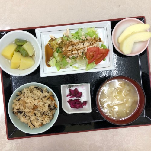 メニューは、混ぜごはん、バンバンジー、じゃがいもの煮物、味噌汁、漬物、りんごです!