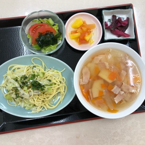 メニューは、しらすと春キャベツのスパゲッティ、トマトサラダ、ポトフ、漬物、ミックスフルーツです