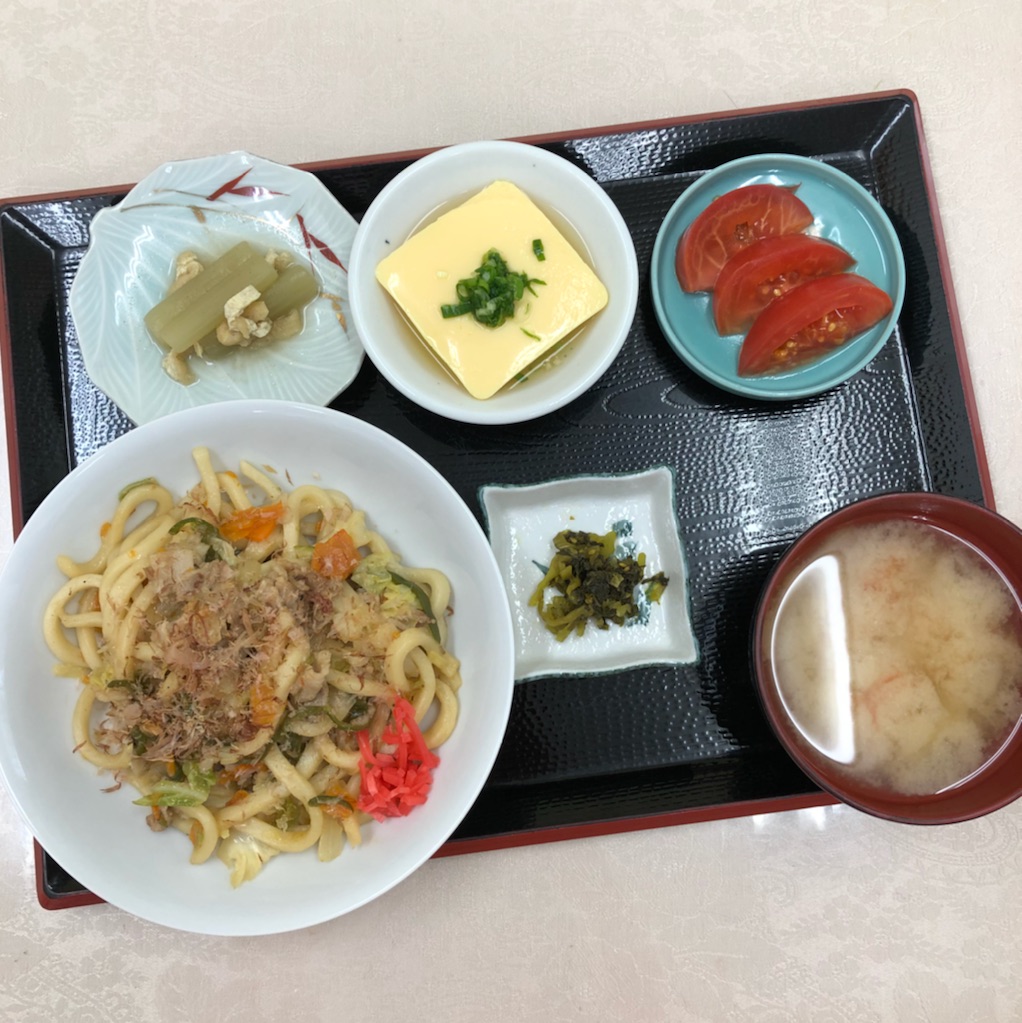 メニューは、焼きうどん、ふきの煮物、卵豆腐、味噌汁、漬物、トマトです!