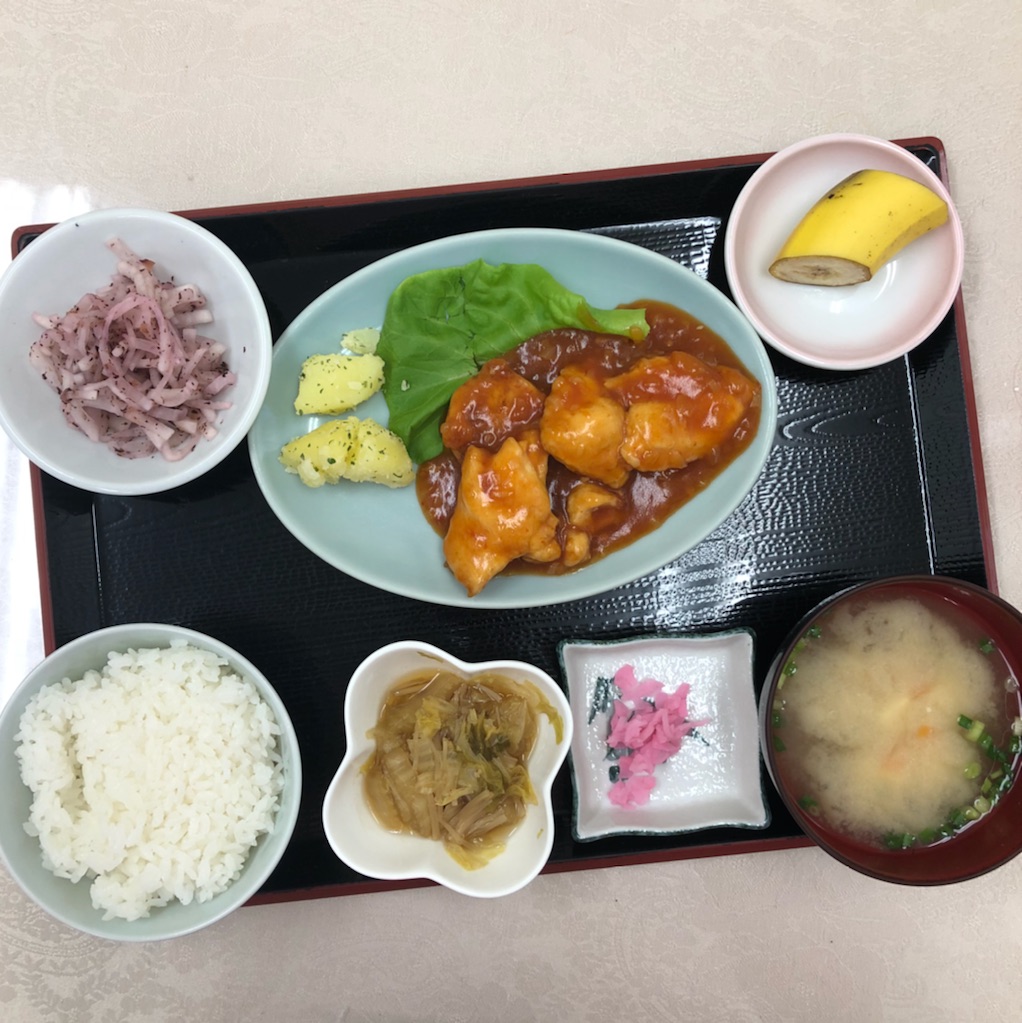 本日の昼食です! メニューは、鶏肉のチリソース、白菜の煮浸し、かぶの梅酢和え、ごはん、味噌汁、漬物、バナナです。
