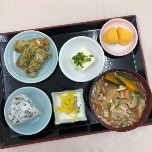 本日の昼食です! メニューは、ほうとう風うどん、ちくわの磯辺揚げ、冷奴、ミニおにぎり、漬物、柿です!