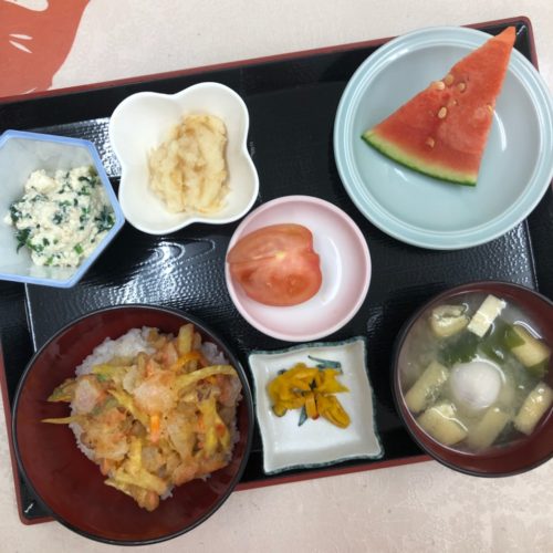 メニューは、かき揚げ天丼、ほうれん草の白和え、大根のなめたけ和え、味噌汁、漬物、トマト、スイカです!