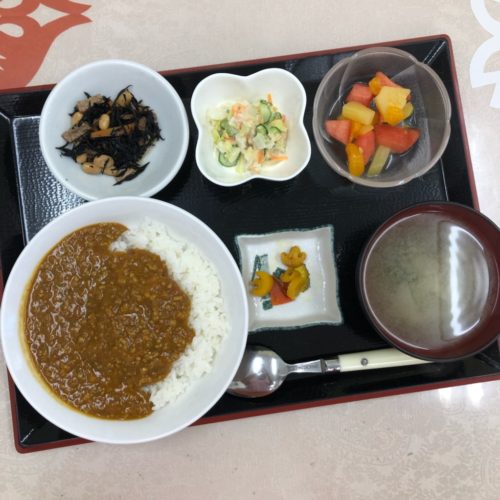 メニューは、キーマカレー、ひじきの煮物、コールスローサラダ、味噌汁、漬物、ミックスフルーツです!