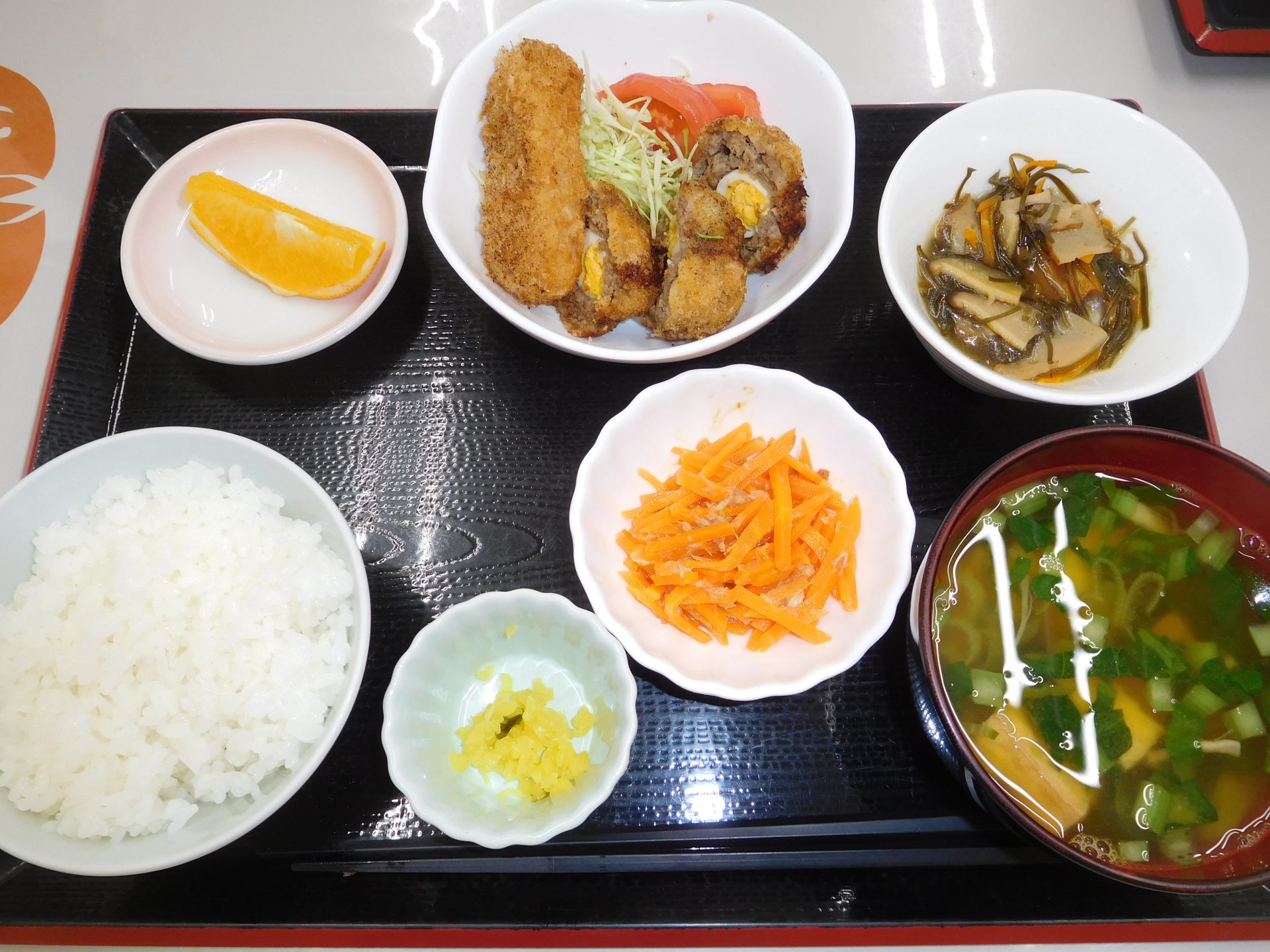 本日の昼食です。メニューは、スコッチエッグ、刻み昆布の煮物、