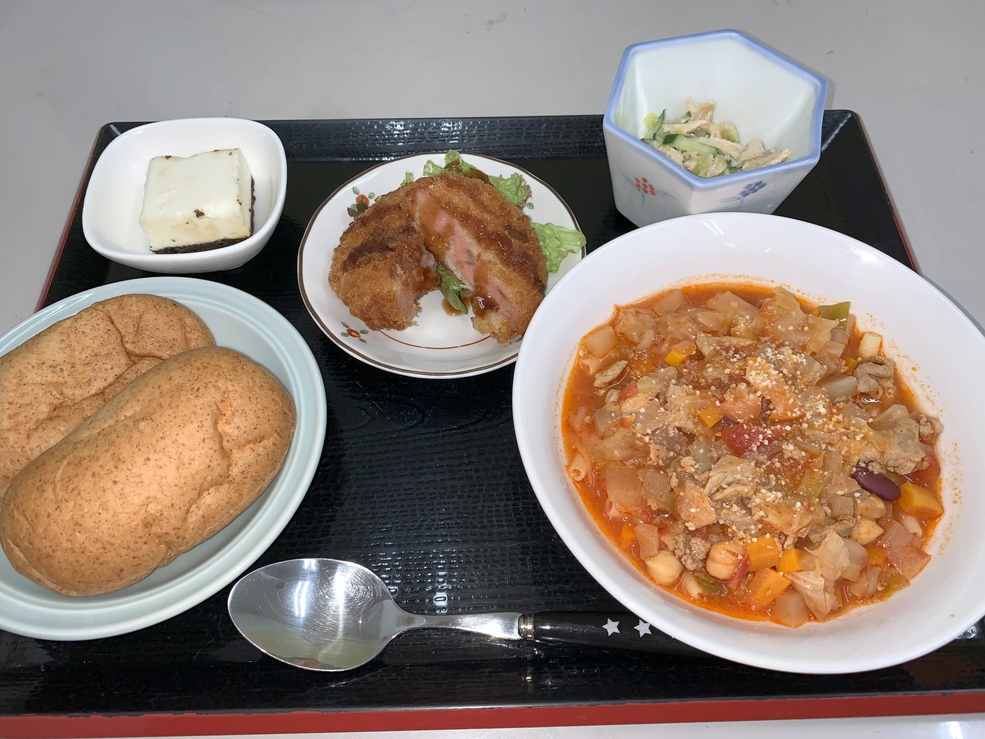 本日の昼食です。メニューは、マカロニ入りミネストローネ、ハムカツ、
