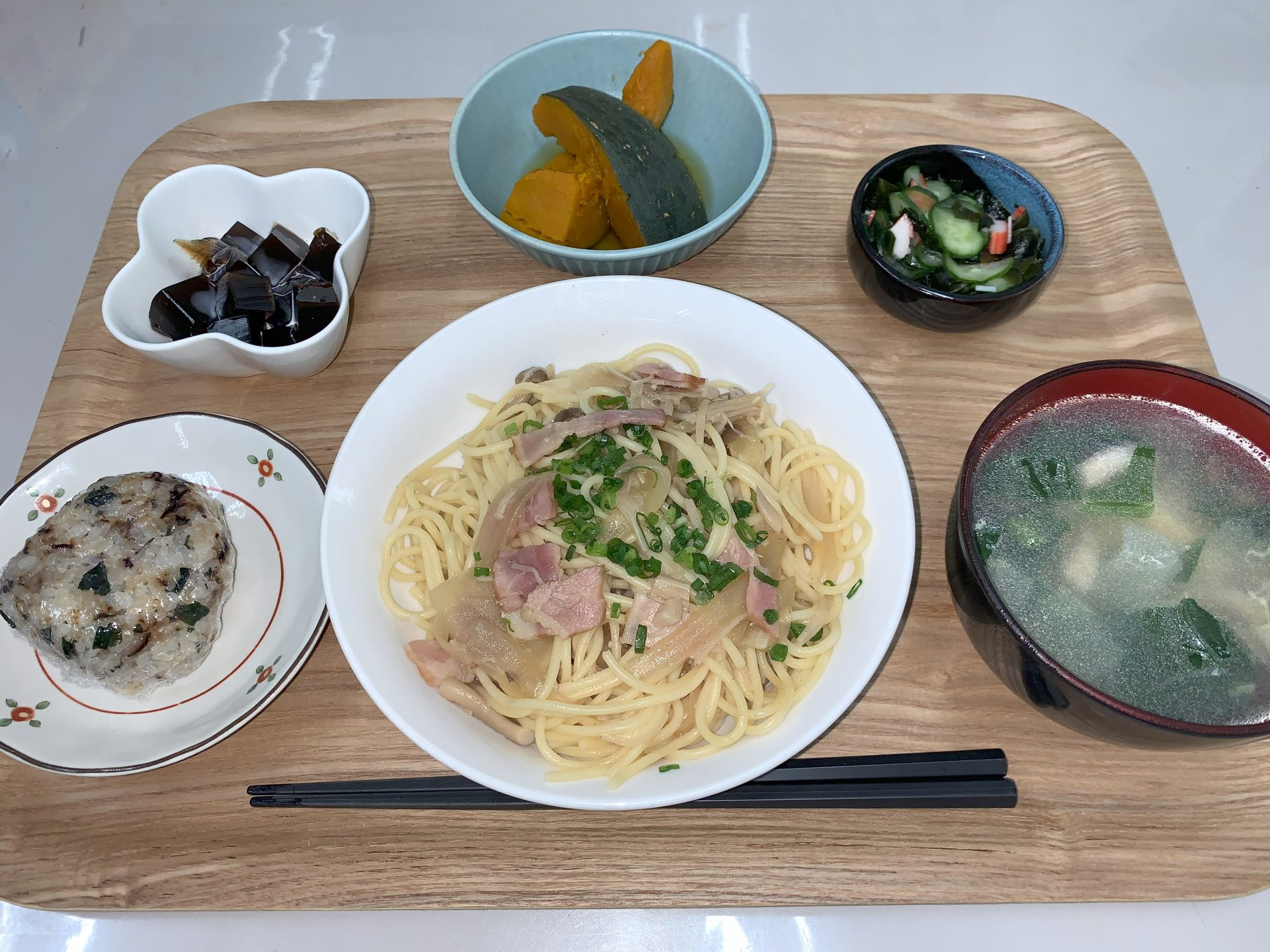 本日の昼食です。メニューは、和風きのこスパゲティ、かぼちゃの煮物、酢の物、ミニおにぎり、スープ、デザートです!